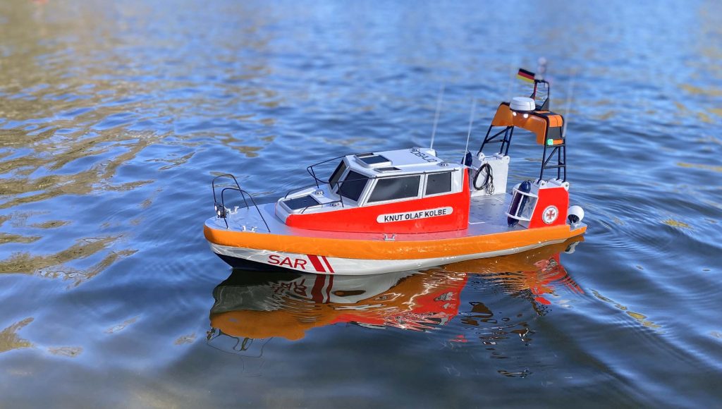 Neue 8,4 Meter Klasse der DGZRS "Knut Olaf Kolbe" Erbauer:Antrieb:Maße in mm (LxB):Besonderheiten: Christoph OppeltElektro, Jetantrieb Brushless Außenläufer 560 x 190 mm, Maßstab 1:15Kompletter 3D Druck, Rumpf besteht aus drei Teilen, Jetantrieb ebenfalls gedrucktLicht und Sound Dozer Boot "Hennes" Erbauer:Antrieb:Maße in mm (LxB):Besonderheiten: Hanjo Hüsch Elektro 280 × 190 mm Rumpf und Aufbauten 3D gedruckt Original ist ein Arbeitsschiff, dient dem „Drücken“ von Baumstämmen Licht und Sound